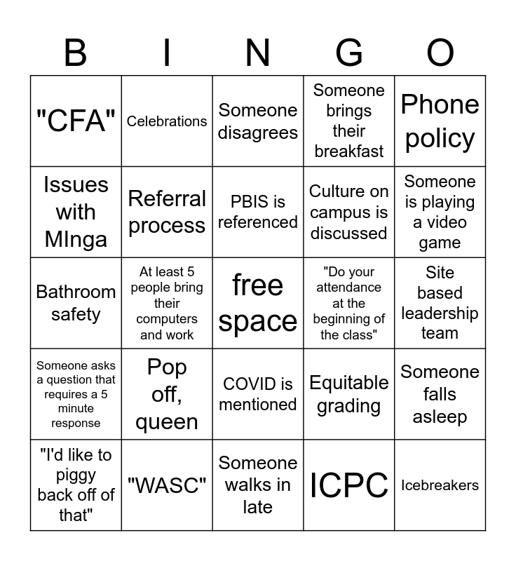 This bingo card has a free space and 24 words: Pop off, queen, "WASC", PBIS is referenced, "I'd like to piggy back off of that", Phone policy, "CFA", Issues with MInga, Celebrations, "Do your attendance at the beginning of the class", COVID is mentioned, Culture on campus is discussed, Bathroom safety, Equitable grading, Someone falls asleep, Referral process, ICPC, Site based leadership team, Someone disagrees, Someone is playing a video game, At least 5 people bring their computers and work, Icebreakers, Someone asks a question that requires a 5 minute response, Someone brings their breakfast and Someone walks in late.