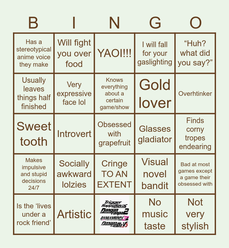 This bingo card has 1 images and 24 words: Socially awkward lolzies, Knows everything about a certain game/show, Is the ‘lives under a rock friend’, “Huh?what did you say?”, Has a stereotypical anime voice they make, Usually leaves things half finished, Will fight you over food, Glasses gladiator, Cringe TO AN EXTENT, Gold lover, Sweet tooth, Visual novel bandit, Bad at most games except a game their obsessed with, Very expressive face lol, Not very stylish, Finds corny tropes endearing, YAOI!!!, Overhtinker, Introvert, Obsessed with grapefruit, Artistic, Makes impulsive and stupid decisions 24/7, I will fall for your gaslighting and No music taste.