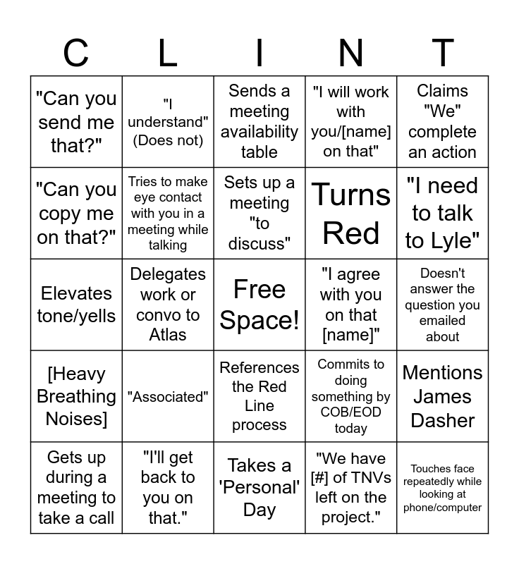 This bingo card has a free space and 24 words: "Associated", "I'll get back to you on that.", Sets up a meeting "to discuss", Gets up during a meeting to take a call, Claims "We" complete an action, "Can you send me that?", "Can you copy me on that?", "I understand" (Does not), "I agree with you on that [name]", References the Red Line process, Turns Red, Elevates tone/yells, Commits to doing something by COB/EOD today, Mentions James Dasher, Tries to make eye contact with you in a meeting while talking, "We have [#] of TNVs left on the project.", Doesn't answer the question you emailed about, Sends a meeting availability table, "I need to talk to Lyle", Delegates work or convo to Atlas, Touches face repeatedly while looking at phone/computer, [Heavy Breathing Noises], "I will work with you/[name] on that" and Takes a 'Personal' Day.