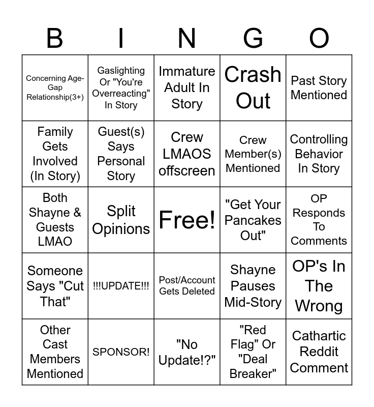 This bingo card has a free space and 24 words: !!!UPDATE!!!, SPONSOR!, Crew LMAOS offscreen, Other Cast Members Mentioned, Past Story Mentioned, Concerning Age-Gap Relationship(3+), Family Gets Involved (In Story), Gaslighting Or "You're Overreacting" In Story, "Get Your Pancakes Out", Post/Account Gets Deleted, Crew Member(s) Mentioned, Both Shayne & Guests LMAO, Shayne Pauses Mid-Story, OP's In The Wrong, Guest(s) Says Personal Story, "Red Flag" Or "Deal Breaker", OP Responds To Comments, Immature Adult In Story, Controlling Behavior In Story, Split Opinions, Cathartic Reddit Comment, Someone Says "Cut That", Crash Out and "No Update!?".