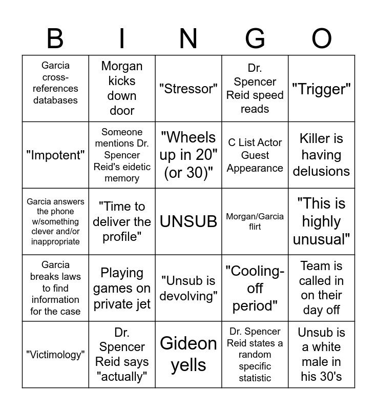 This bingo card has a free space and 24 words: Playing games on private jet, Dr. Spencer Reid says "actually", "Wheels up in 20" (or 30)", "Victimology", "Trigger", Garcia cross-references databases, "Impotent", Morgan kicks down door, Morgan/Garcia flirt, "Unsub is devolving", C List Actor Guest Appearance, Garcia answers the phone w/something clever and/or inappropriate, "Cooling-off period", Team is called in on their day off, Someone mentions Dr. Spencer Reid's eidetic memory, Dr. Spencer Reid states a random specific statistic, "This is highly unusual", "Stressor", Killer is having delusions, "Time to deliver the profile", Unsub is a white male in his 30's, Garcia breaks laws to find information for the case, Dr. Spencer Reid speed reads and Gideon yells.