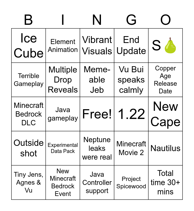 This bingo card has a free space and 24 words: Experimental Data Pack, New Minecraft Bedrock Event, Meme-able Jeb, Tiny Jens, Agnes & Vu, S🍐, Ice Cube, Terrible Gameplay, Element Animation, 1.22, Neptune leaks were real, Vu Bui speaks calmly, Minecraft Bedrock DLC, Minecraft Movie 2, Nautilus, Multiple Drop Reveals, Project Spicewood, New Cape, Vibrant Visuals, Copper Age Release Date, Java gameplay, Total time 30+ mins, Outside shot, End Update and Java Controller support.