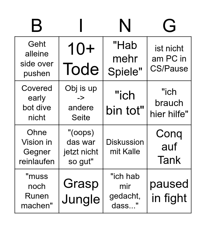 This bingo card has 16 words: Grasp Jungle, Conq auf Tank, "Hab mehr Spiele", Geht alleine side over pushen, Ohne Vision in Gegner reinlaufen, 10+ Tode, Diskussion mit Kalle, "ich hab mir gedacht, dass...", Covered early bot dive nicht, Obj is up -> andere Seite, "muss noch Runen machen", ist nicht am PC in CS/Pause, "(oops) das war jetzt nicht so gut", "ich brauch hier hilfe", "ich bin tot" and paused in fight.