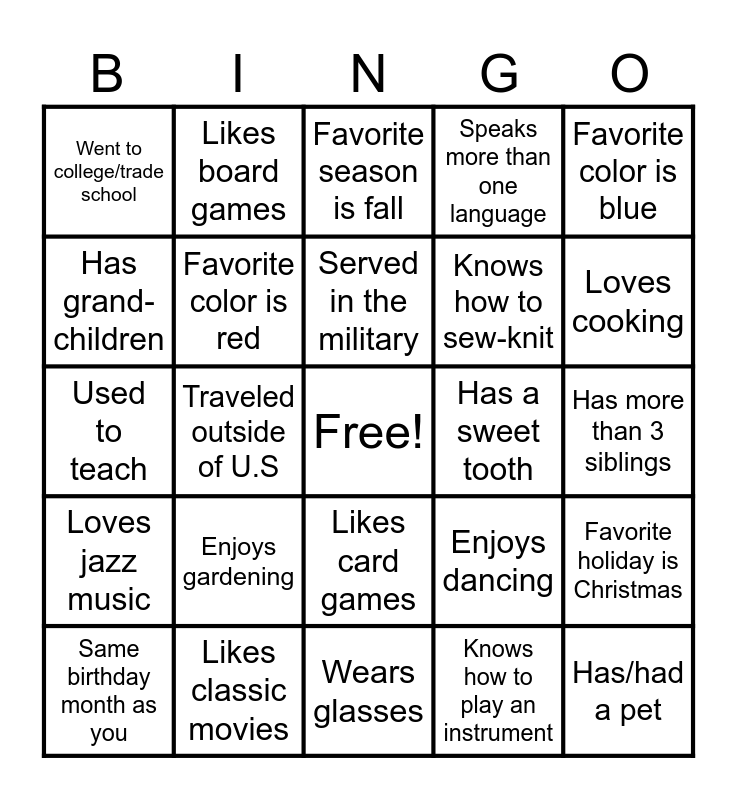 This bingo card has a free space and 24 words: Enjoys gardening, Likes classic movies, Served in the military, Same birthday month as you, Favorite color is blue, Went to college/trade school, Has grand- children, Likes board games, Has a sweet tooth, Likes card games, Knows how to sew-knit, Used to teach, Enjoys dancing, Favorite holiday is Christmas, Favorite color is red, Knows how to play an instrument, Has more than 3 siblings, Favorite season is fall, Loves cooking, Traveled outside of U.S, Has/had a pet, Loves jazz music, Speaks more than one language and Wears glasses.