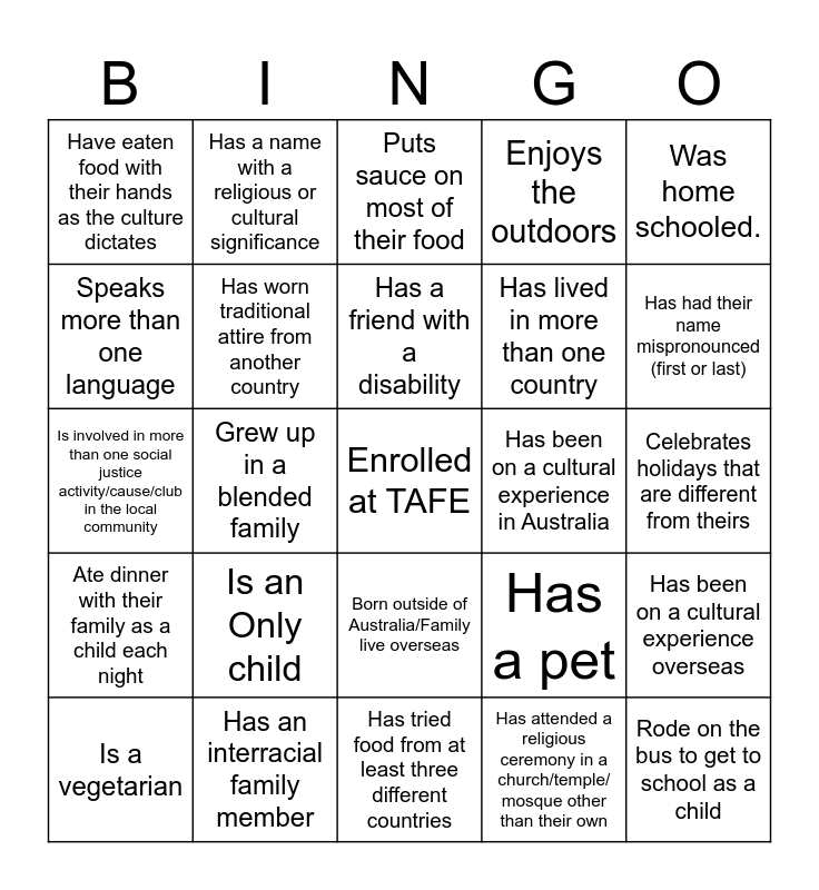 This bingo card has a free space and 26 words: Born outside of Australia/Family live overseas, Has attended a religious ceremony in a church/temple/ mosque other than their own, Has a friend with a disability, Has an interracial family member, Was home schooled., Have eaten food with their hands as the culture dictates, Speaks more than one language, Has a name with a religious or cultural significance, Celebrates holidays that are different from theirs, Has a pet, Has lived in more than one country, Is involved in more than one social justice activity/cause/club in the local community, Has been on a cultural experience overseas, Is a vegetarian, Grew up in a blended family, Can speak 3 or more languages, Enjoys the outdoors, Ate dinner with their family as a child each night, Puts sauce on most of their food, Rode on the bus to get to school as a child, Has had their name mispronounced (first or last), Has tried food from at least three different countries, Has been on a cultural experience in Australia, Is an Only child, Has worn traditional attire from another country and Needs a Coffee run.