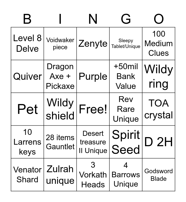 This bingo card has a free space and 24 words: 28 items Gauntlet, Zulrah unique, Purple, Venator Shard, 100 Medium Clues, Level 8 Delve, Quiver, Voidwaker piece, Rev Rare Unique, Desert treasure II Unique, +50mil Bank Value, Pet, Spirit Seed, D 2H, Dragon Axe + Pickaxe, 4 Barrows Unique, TOA crystal, Zenyte, Wildy ring, Wildy shield, Godsword Blade, 10 Larrens keys, Sleepy Tablet/Unique and 3 Vorkath Heads.