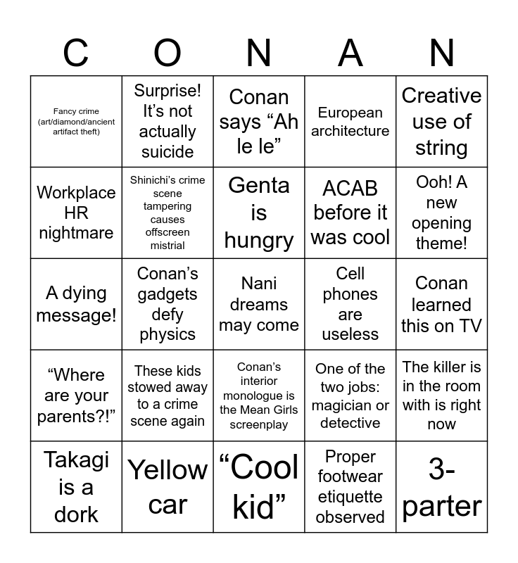 This bingo card has a free space and 59 words: Bathroom crime scene, Yellow car, Agatha Christie serial numbers filed off, “Where are your parents?!”, Proper footwear etiquette observed, English lyrics in intro/closing theme song, Shinichi’s crime scene tampering causes offscreen mistrial, Shinichi unfazed by gruesome crime scene, ACAB before it was cool, Mouri giving big “divorced dad” energy, European architecture, Nothing good comes from the Internet, Workplace HR nightmare, Japanese pun lost in translation, Shinichi gaslighting Ran, Fancy crime (art/diamond/ancient artifact theft), 3-parter, Creative use of string, Will these childhood friends get together??, Genta is hungry, Cell phones are useless, Conan says “Ah le le”, Takagi is a dork, The killer is in the room with is right now, Someone gets a concerning glowy head injury, Totally not a well-known brand name, A mysterious black-clothed figure did it!, Surprise Kaito Kid, Ooh! A new opening theme!, The final clue is a random pun, The victim is an asshole, Sonoko is a walking HR violation, Someone call Social Services, The culprit confesses all, Surprise! It’s not actually suicide, Shinichi learned this skill in Hawaii, Hattori fails at secret identities, Conan’s gadgets defy physics, This is absolutely a native English speaker, we promise, A dying message!, Osaka tourism promotion, These kids stowed away to a crime scene again, Conan learned this on TV, This person is actually a double-reverse quadruple agent, Statute of limitations plot point, “I'm a detective” catchphrase, Shinichi/Conan fails at code-switching, This person needs therapy, Conan’s interior monologue is the Mean Girls screenplay, “Cool kid”, Somewhere, Rowling feels a disturbance in the TERF, Someone check on Reggie: another video game developer is dead, Trains are deathtraps on wheels, “I want to speak to my attorney,” said no one, ever, Conan actually dressed like a human child for once, One of the two jobs: magician or detective, Ran deserves better, The gang plausibly rub elbows with Henry Kissinger at upper crust shindig and That was no trick, Michael… IT WAS MY ILLUSION.
