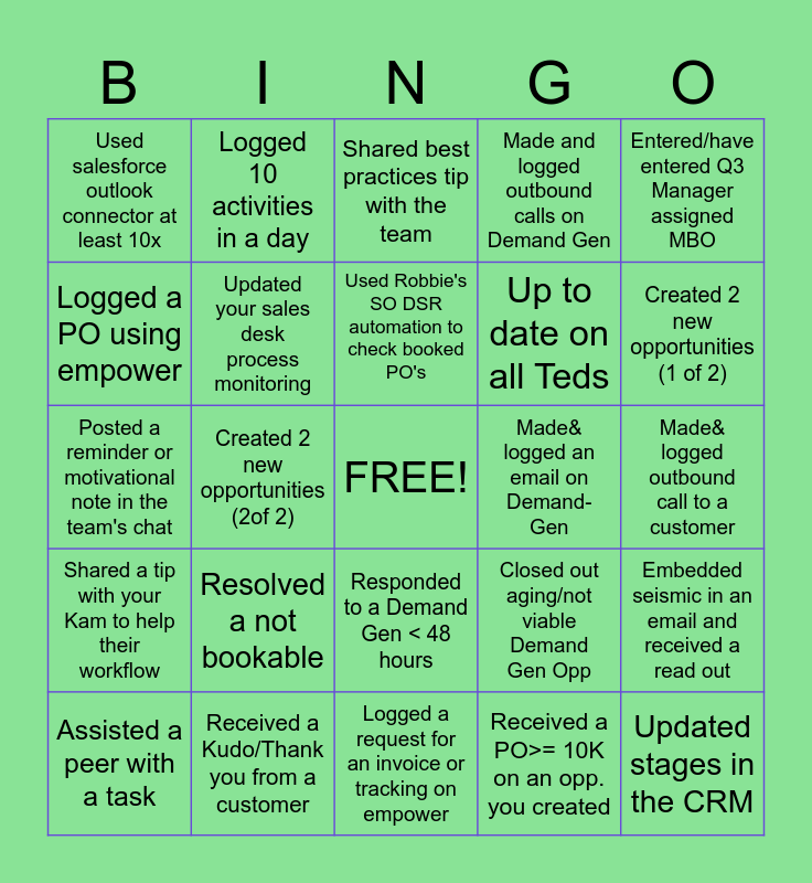 This bingo card has a free space and 24 words: Resolved a not bookable, Received a Kudo/Thank you from a customer, Used Robbie's SO DSR automation to check booked PO's, Assisted a peer with a task, Entered/have entered Q3 Manager assigned MBO, Used salesforce outlook connector at least 10x, Logged a PO using empower, Logged 10 activities in a day, Made& logged an email on Demand- Gen, Responded to a Demand Gen < 48 hours, Up to date on all Teds, Posted a reminder or motivational note in the team's chat, Closed out aging/not viable Demand Gen Opp, Embedded seismic in an email and received a read out, Updated your sales desk process monitoring, Received a PO>= 10K on an opp. you created, Made& logged outbound call to a customer, Shared best practices tip with the team, Created 2 new opportunities (1 of 2), Created 2 new opportunities (2of 2), Updated stages in the CRM, Shared a tip with your Kam to help their workflow, Made and logged outbound calls on Demand Gen and Logged a request for an invoice or tracking on empower.