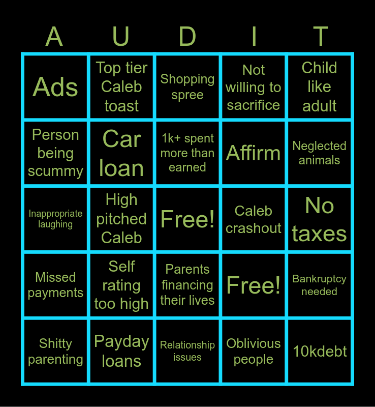 This bingo card has a free space and 24 words: Self rating too high, Payday loans, 1k+ spent more than earned, Shitty parenting, Child like adult, Ads, Person being scummy, Top tier Caleb toast, Caleb crashout, Parents financing their lives, Affirm, Inappropriate laughing, Free!, Bankruptcy needed, Car loan, Oblivious people, No taxes, Shopping spree, Neglected animals, High pitched Caleb, 10kdebt, Missed payments, Not willing to sacrifice and Relationship issues.