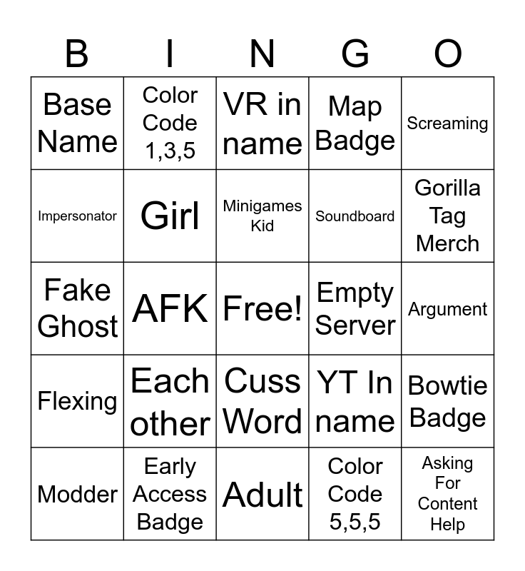 This bingo card has a free space and 24 words: Each other, Early Access Badge, Minigames Kid, Modder, Screaming, Base Name, Impersonator, Color Code 1,3,5, Empty Server, Cuss Word, Soundboard, Fake Ghost, YT In name, Bowtie Badge, Girl, Color Code 5,5,5, Argument, VR in name, Gorilla Tag Merch, AFK, Asking For Content Help, Flexing, Map Badge and Adult.