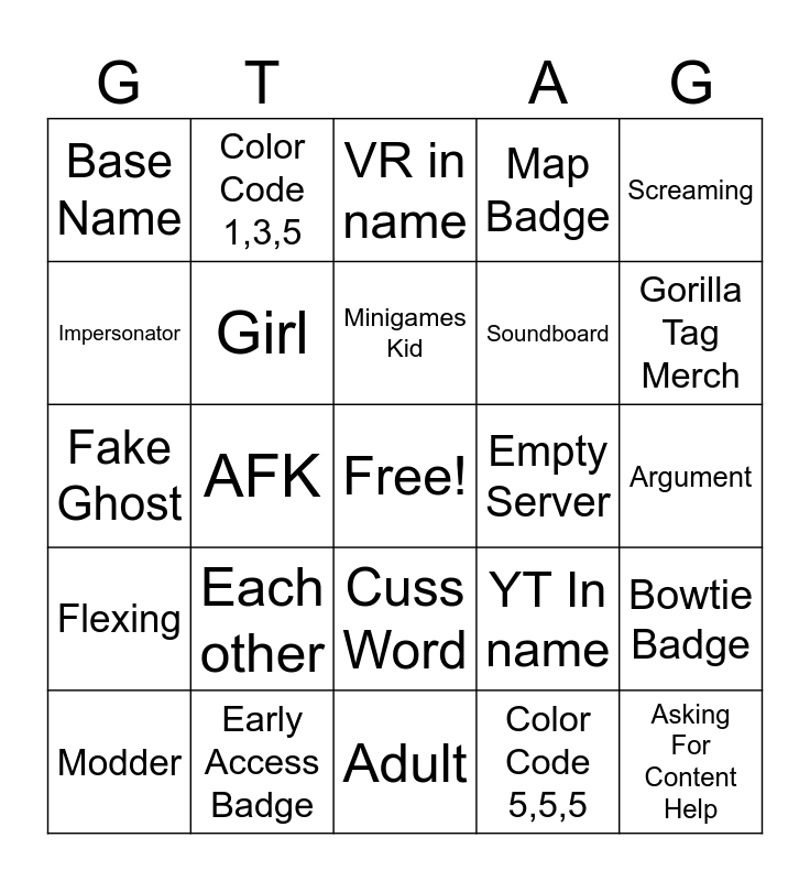 This bingo card has a free space and 24 words: Each other, Early Access Badge, Minigames Kid, Modder, Screaming, Base Name, Impersonator, Color Code 1,3,5, Empty Server, Cuss Word, Soundboard, Fake Ghost, YT In name, Bowtie Badge, Girl, Color Code 5,5,5, Argument, VR in name, Gorilla Tag Merch, AFK, Asking For Content Help, Flexing, Map Badge and Adult.