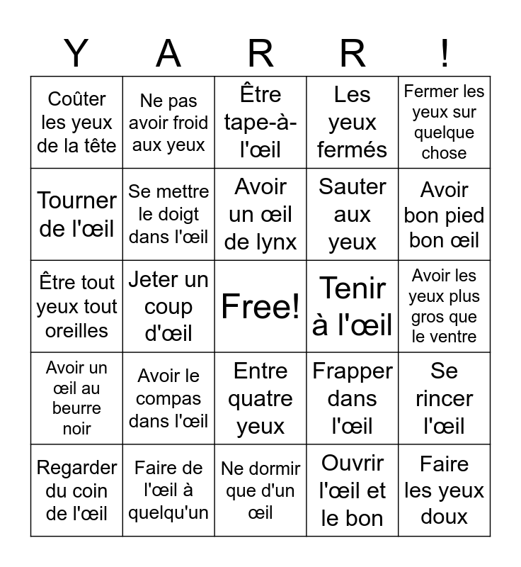 This bingo card has a free space and 24 words: Avoir le compas dans l'œil, Faire de l'œil à quelqu'un, Avoir un œil de lynx, Regarder du coin de l'œil, Fermer les yeux sur quelque chose, Coûter les yeux de la tête, Tourner de l'œil, Ne pas avoir froid aux yeux, Tenir à l'œil, Entre quatre yeux, Sauter aux yeux, Être tout yeux tout oreilles, Frapper dans l'œil, Se rincer l'œil, Se mettre le doigt dans l'œil, Ouvrir l'œil et le bon, Avoir les yeux plus gros que le ventre, Être tape-à-l'œil, Avoir bon pied bon œil, Jeter un coup d'œil, Faire les yeux doux, Avoir un œil au beurre noir, Les yeux fermés and Ne dormir que d'un œil.