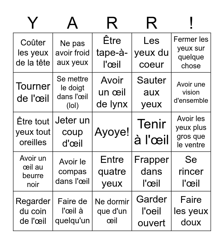 This bingo card has a free space and 24 words: Avoir le compas dans l'œil, Faire de l'œil à quelqu'un, Avoir un œil de lynx, Regarder du coin de l'œil, Fermer les yeux sur quelque chose, Coûter les yeux de la tête, Tourner de l'œil, Ne pas avoir froid aux yeux, Tenir à l'œil, Entre quatre yeux, Sauter aux yeux, Être tout yeux tout oreilles, Frapper dans l'œil, Se rincer l'œil, Se mettre le doigt dans l'œil (lol), Garder l'oeil ouvert, Avoir les yeux plus gros que le ventre, Être tape-à-l'œil, Avoir une vision d'ensemble, Jeter un coup d'œil, Faire les yeux doux, Avoir un œil au beurre noir, Les yeux du coeur and Ne dormir que d'un œil.