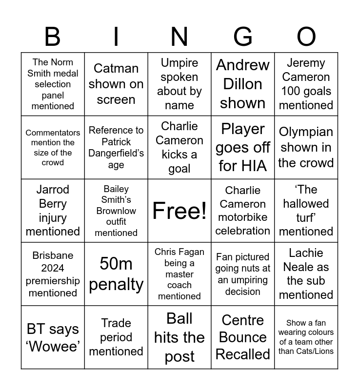 This bingo card has a free space and 52 words: Show a family member in the crowd, Show a fan wearing colours of a team other than Cats/Lions, Snoop Dogg shown in the crowd, Ball hits the post, 50m penalty, BT talks nonsense, Catman shown on screen, Fan with full facepaint shown, Commentators mention the size of the crowd, Commentators talk about the weather, Reference to Patrick Dangerfield’s age, Oscar McInerny Fairytale storyline mentioned, Lachie Neale as the sub mentioned, Fan pictured going nuts at an umpiring decision, Ashcroft brothers mentioned in the same sentence, Gryan Miers being the best inside 50 kick in the league mentioned, Charlie Cameron kicks a goal, Charlie Cameron motorbike celebration, Jeremy Cameron Coleman mentioned, Jeremy Cameron 100 goals mentioned, Bailey Smith’s Brownlow outfit mentioned, Centre Bounce Recalled, The Norm Smith medal selection panel mentioned, Player goes off for HIA, Blood Rule, Talk about Tom Stewart Injury, Mabior Chol mentioned, Commentators call a player by the wrong name, Olympian shown in the crowd, AFLW mentioned, Mention that a player is Irish, Andrew Dillon shown, Tyson Stengle goal, Player takes a bounce, Score review, Umpire spoken about by name, Trade period mentioned, Luke Hodge talks about when he played at Brisbane, Luke Hodge asked about playing on GF Day, James Brayshaw talks about where a player went to school, James Brayshaw says ‘here we are!’, ‘The hallowed turf’ mentioned, Brisbane 2024 premiership mentioned, Brisbane making three grand finals in a row mentioned, Chris Fagan being a master coach mentioned, Commentators question an umpiring decision, Harris Andrews spoils a ball, Jarrod Berry injury mentioned, Matt Rowell Brownlow mentioned, Joel Selwood mentioned, BT says ‘Wowee’ and BT says ‘boy oh boy’.