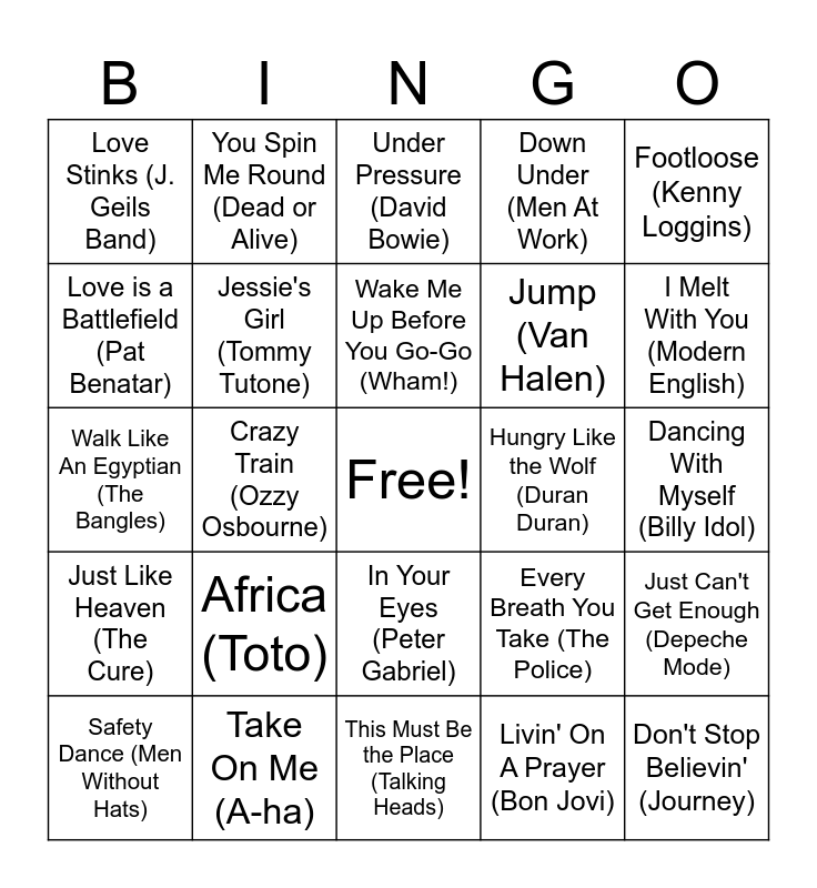 This bingo card has a free space and 24 words: Africa (Toto), Take On Me (A-ha), Wake Me Up Before You Go-Go (Wham!), Safety Dance (Men Without Hats), Footloose (Kenny Loggins), Love Stinks (J. Geils Band), Love is a Battlefield (Pat Benatar), You Spin Me Round (Dead or Alive), Hungry Like the Wolf (Duran Duran), In Your Eyes (Peter Gabriel), Jump (Van Halen), Walk Like An Egyptian (The Bangles), Every Breath You Take (The Police), Just Can't Get Enough (Depeche Mode), Jessie's Girl (Tommy Tutone), Livin' On A Prayer (Bon Jovi), Dancing With Myself (Billy Idol), Under Pressure (David Bowie), I Melt With You (Modern English), Crazy Train (Ozzy Osbourne), Don't Stop Believin' (Journey), Just Like Heaven (The Cure), Down Under (Men At Work) and This Must Be the Place (Talking Heads).