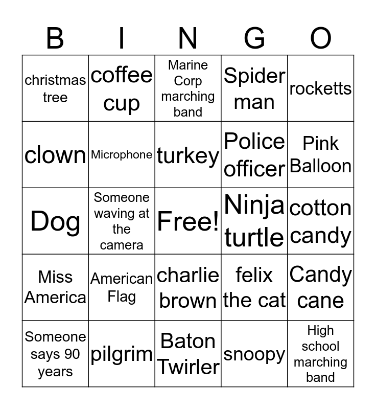 This bingo card has a free space and 26 words: charlie brown, snoopy, turkey, pilgrim, rocketts, christmas tree, clown, coffee cup, cotton candy, felix the cat, Police officer, Dog, Candy cane, Someone says 90 years, Someone waving at the camera, Horse, Spider man, Miss America, Marine Corp marching band, High school marching band, Pink Balloon, Baton Twirler, Ninja turtle, American Flag, Microphone and Toy Soldier.