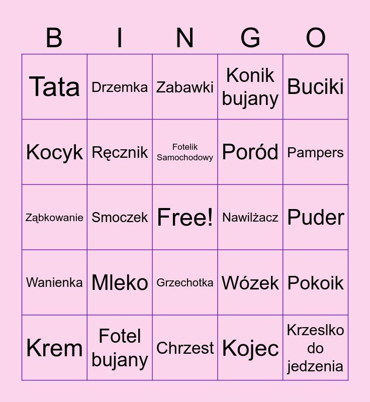 This bingo card has a free space and 42 words: Butelka, Fotelik Samochodowy, Szumiacz, Mleko, Kojec, Pokoik, Krzeslko do jedzenia, Kołyska, Zabawki, Grzechotka, Puder, Pampers, Smoczek, Buciki, Skarpetki, Wózek, Siniak, Ząbkowanie, Karmienie Piersia, Drzemka, Kocyk, Noworodek, Mama, Tata, Płacz, Uśmiech, Poród, Bujak, Huśtawka, Śpioszki, Książeczka, Wanienka, Ręcznik, Chrzest, Szczotka, Krem, Fotel bujany, Nawilżacz, Kamera, Gryzak, Konik bujany and Klocki.