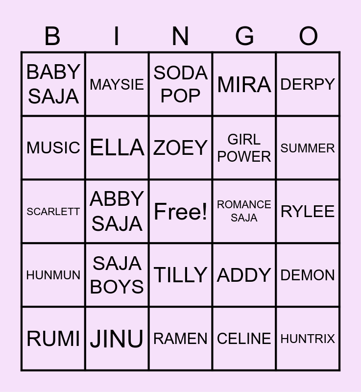 This bingo card has a free space and 30 words: TIGER, JINU, SODA POP, MYSTERY SAJA, DERPY, BABY SAJA, ELLA, ZOEY, GIRL POWER, HUNTRIX, RUMI, SAJA BOYS, CELINE, KOREA, HUNMUN, PRE SHOW, RAMEN, ROMANCE SAJA, DEMON, MUSIC, ABBY SAJA, BOBBY, MIRA, RYLEE, SCARLETT, MAYSIE, TILLY, ADDY, SUMMER and PAISLEY.