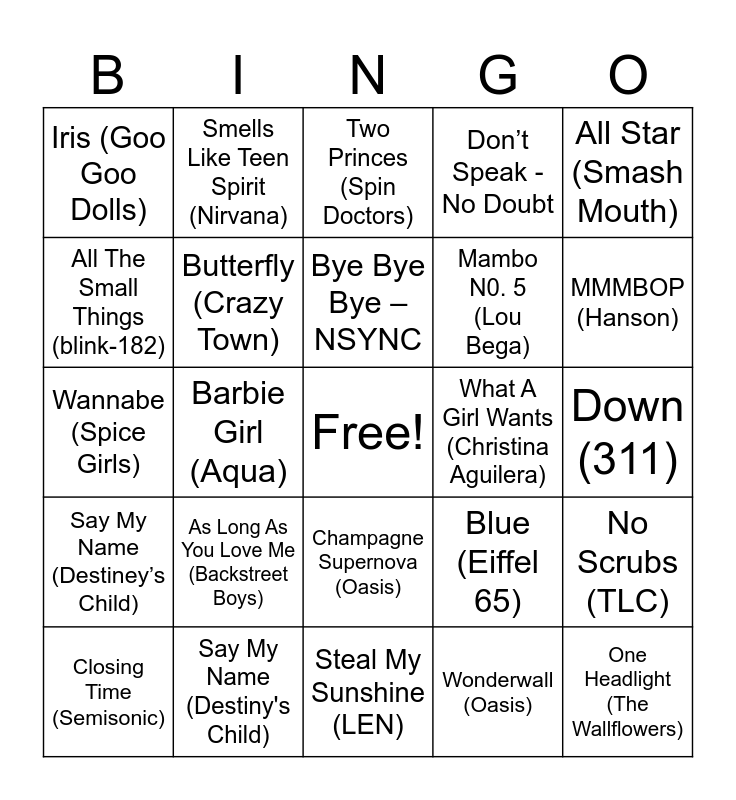 This bingo card has a free space and 24 words: As Long As You Love Me (Backstreet Boys), Say My Name (Destiny's Child), Bye Bye Bye – NSYNC, Closing Time (Semisonic), All Star (Smash Mouth), Iris (Goo Goo Dolls), All The Small Things (blink-182), Smells Like Teen Spirit (Nirvana), What A Girl Wants (Christina Aguilera), Champagne Supernova (Oasis), Mambo N0. 5 (Lou Bega), Wannabe (Spice Girls), Blue (Eiffel 65), No Scrubs (TLC), Butterfly (Crazy Town), Wonderwall (Oasis), Down (311), Two Princes (Spin Doctors), MMMBOP (Hanson), Barbie Girl (Aqua), One Headlight (The Wallflowers), Say My Name (Destiney’s Child), Don’t Speak - No Doubt and Steal My Sunshine (LEN).