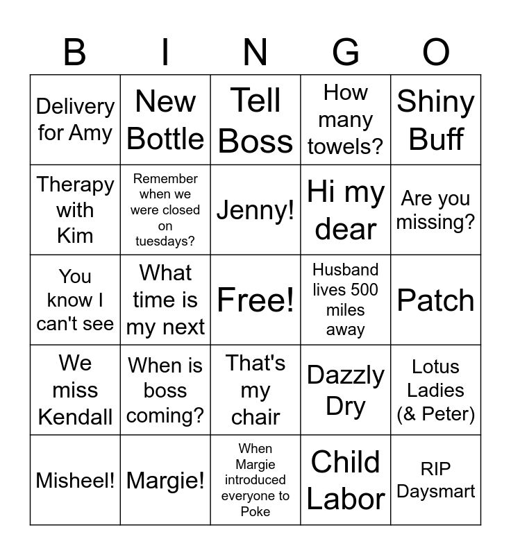 This bingo card has a free space and 24 words: When is boss coming?, Margie!, Jenny!, Misheel!, Shiny Buff, Delivery for Amy, Therapy with Kim, New Bottle, Husband lives 500 miles away, That's my chair, Hi my dear, You know I can't see, Dazzly Dry, Lotus Ladies (& Peter), Remember when we were closed on tuesdays?, Child Labor, Patch, Tell Boss, Are you missing?, What time is my next, RIP Daysmart, We miss Kendall, How many towels? and When Margie introduced everyone to Poke.