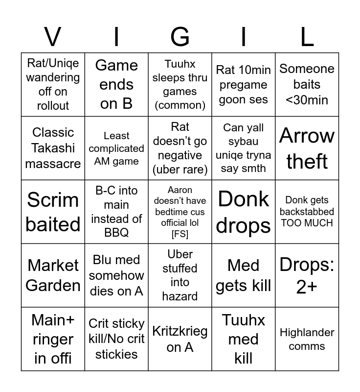 This bingo card has a free space and 24 words: Blu med somehow dies on A, Crit sticky kill/No crit stickies, Rat doesn’t go negative (uber rare), Main+ ringer in offi, Someone baits <30min, Rat/Uniqe wandering off on rollout, Classic Takashi massacre, Game ends on B, Donk drops, Uber stuffed into hazard, Can yall sybau uniqe tryna say smth, Scrim baited, Med gets kill, Drops: 2+, Least complicated AM game, Tuuhx med kill, Donk gets backstabbed TOO MUCH, Tuuhx sleeps thru games (common), Arrow theft, B-C into main instead of BBQ, Highlander comms, Market Garden, Rat 10min pregame goon ses and Kritzkrieg on A.