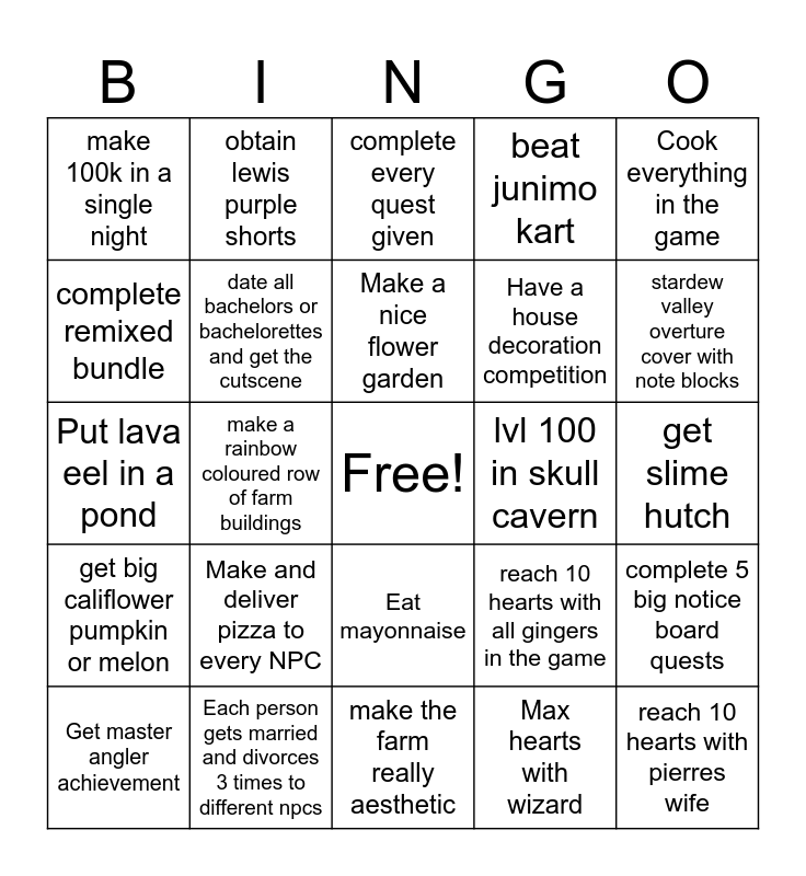 This bingo card has a free space and 24 words: Make and deliver pizza to every NPC, Each person gets married and divorces 3 times to different npcs, Make a nice flower garden, Get master angler achievement, Cook everything in the game, make 100k in a single night, complete remixed bundle, obtain lewis purple shorts, lvl 100 in skull cavern, Eat mayonnaise, Have a house decoration competition, Put lava eel in a pond, reach 10 hearts with all gingers in the game, complete 5 big notice board quests, date all bachelors or bachelorettes and get the cutscene, Max hearts with wizard, get slime hutch, complete every quest given, stardew valley overture cover with note blocks, make a rainbow coloured row of farm buildings, reach 10 hearts with pierres wife, get big califlower pumpkin or melon, beat junimo kart and make the farm really aesthetic.