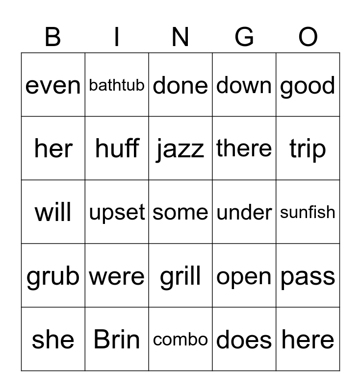 This bingo card has a free space and 24 words: were, Brin, jazz, she, good, even, her, bathtub, under, grill, there, will, open, pass, huff, does, sunfish, done, trip, upset, here, grub, down and combo.