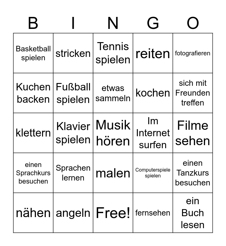 This bingo card has 31 words: Free!, Gitarre spielen, Klavier spielen, Geige spielen, Basketball spielen, Tennis spielen, Fußball spielen, Computerspiele spielen, Im Internet surfen, fernsehen, Filme sehen, Musik hören, ein Buch lesen, mit Freunden ausgehen, sich mit Freunden treffen, tanzen, einen Tanzkurs besuchen, Sprachen lernen, einen Sprachkurs besuchen, malen, fotografieren, basteln, nähen, stricken, kochen, Kuchen backen, reiten, klettern, angeln, etwas sammeln and schwimmen.