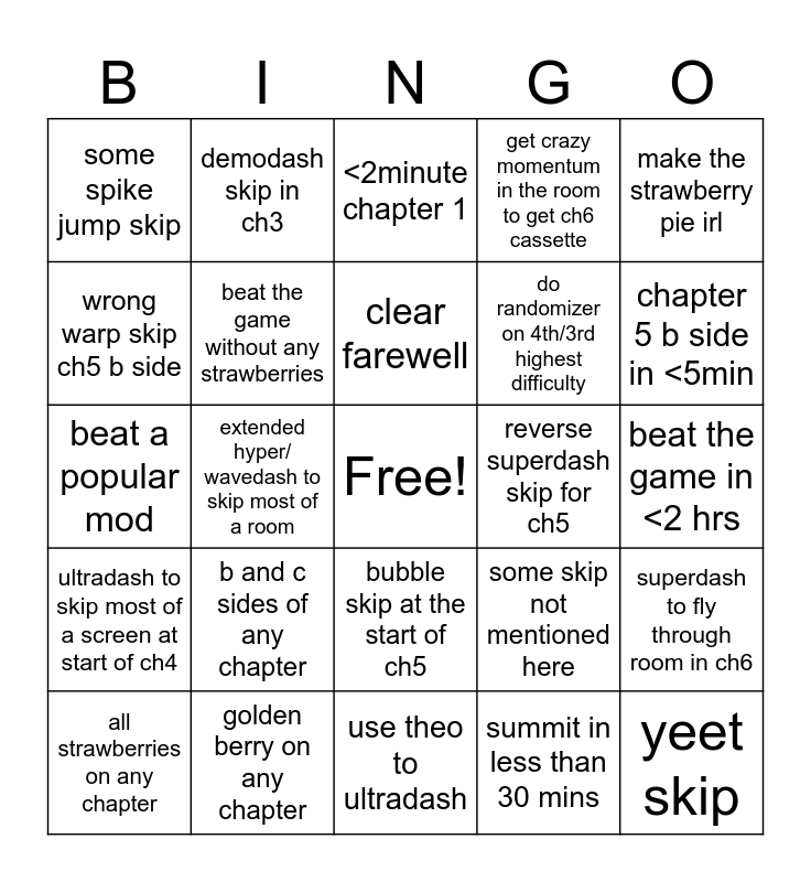 This bingo card has a free space and 24 words: b and c sides of any chapter, golden berry on any chapter, clear farewell, all strawberries on any chapter, make the strawberry pie irl, some spike jump skip, wrong warp skip ch5 b side, demodash skip in ch3, reverse superdash skip for ch5, bubble skip at the start of ch5, do randomizer on 4th/3rd highest difficulty, beat a popular mod, some skip not mentioned here, superdash to fly through room in ch6, beat the game without any strawberries, summit in less than 30 mins, beat the game in <2 hrs, <2minute chapter 1, chapter 5 b side in <5min, extended hyper/ wavedash to skip most of a room, yeet skip, ultradash to skip most of a screen at start of ch4, get crazy momentum in the room to get ch6 cassette and use theo to ultradash.