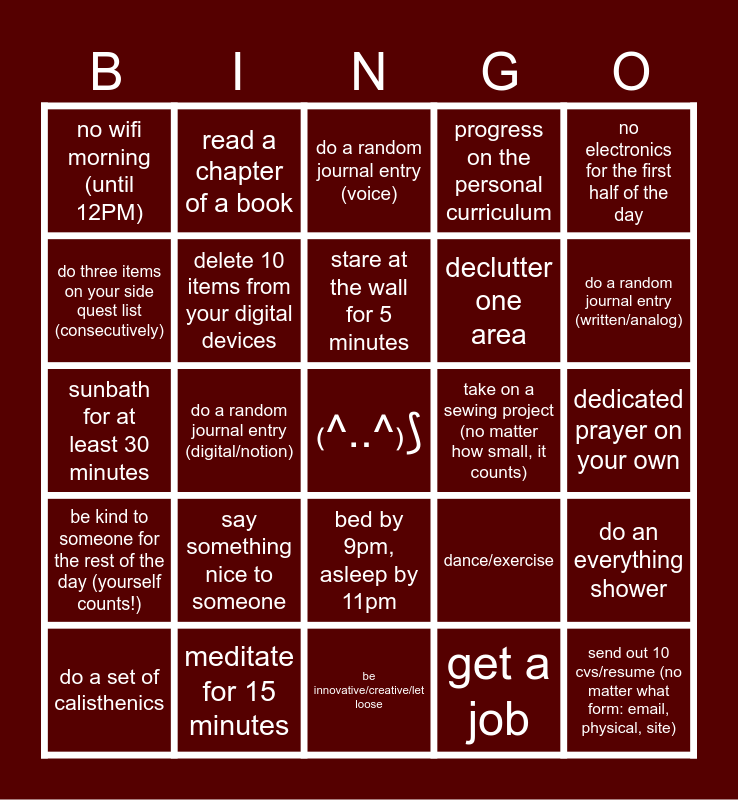 This bingo card has a free space and 24 words: say something nice to someone, meditate for 15 minutes, stare at the wall for 5 minutes, do a set of calisthenics, no electronics for the first half of the day, no wifi morning (until 12PM), do three items on your side quest list (consecutively), read a chapter of a book, take on a sewing project (no matter how small, it counts), bed by 9pm, asleep by 11pm, declutter one area, sunbath for at least 30 minutes, dance/exercise, do an everything shower, delete 10 items from your digital devices, get a job, dedicated prayer on your own, do a random journal entry (voice), do a random journal entry (written/analog), do a random journal entry (digital/notion), send out 10 cvs/resume (no matter what form: email, physical, site), be kind to someone for the rest of the day (yourself counts!), progress on the personal curriculum and be innovative/creative/let loose.