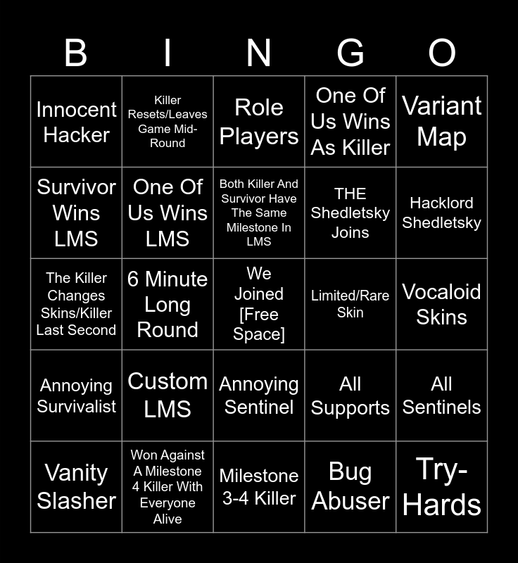 This bingo card has a free space and 49 words: Exploiters, Try-Hards, Yourself Skin, Milestone 3-4 Killer, Custom LMS, Survivor Rage Quits Mid-Chase, Killer Resets/Leaves Game Mid-Round, All The Survivors Win, Survivor Wins LMS, Killer Wins The Round, One Of Us Wins LMS, One Of Us Wins As Killer, All Sentinels, All Supports, All Survivalists, Noob Survivor/Killer, Both Killer And Survivor Have The Same Milestone In LMS, Limited/Rare Skin, Super Fast Round, Variant Map, 6 Minute Long Round, Bug Abuser, Innocent Hacker, THE Shedletsky Joins, One Of Our Friends Join, Hacklord Shedletsky, Vanity Slasher, Green Bean Avatar, Annoying Sentinel, Annoying Survivalist, Skinless Killer, Killer/Survivor Is AFK, One Of Us Accidentally Use One Of Our Abilities, Killer Gets Bullied By The Sentinels, Won Against A Milestone 4 Killer With Everyone Alive, Teamers [Killer Leaves A Survivor As LMS Repeatedly], Annoying Taph, Useless Support, Vocaloid Skins, LMS Ends Abruptly, Round Ends Abruptly, Chance's Gun Explodes & He Dies, LMS Happens Instantly, One Of Us Gets An Achievement, The Killer Changes Skins/Killer Last Second, Role Players, Survivor Doesn't Use Their Abilities, The Killer Is Chill and Player With 100K+ Forsaken Points.