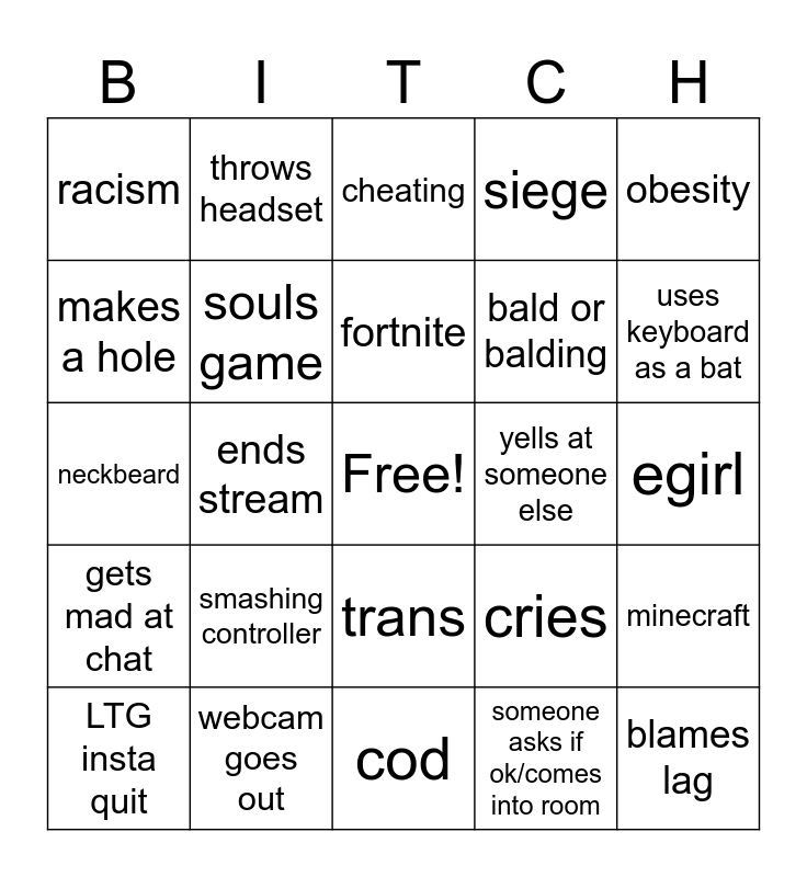 This bingo card has a free space and 24 words: smashing controller, webcam goes out, fortnite, LTG insta quit, obesity, racism, makes a hole, throws headset, yells at someone else, trans, bald or balding, neckbeard, cries, minecraft, souls game, someone asks if ok/comes into room, egirl, cheating, uses keyboard as a bat, ends stream, blames lag, gets mad at chat, siege and cod.