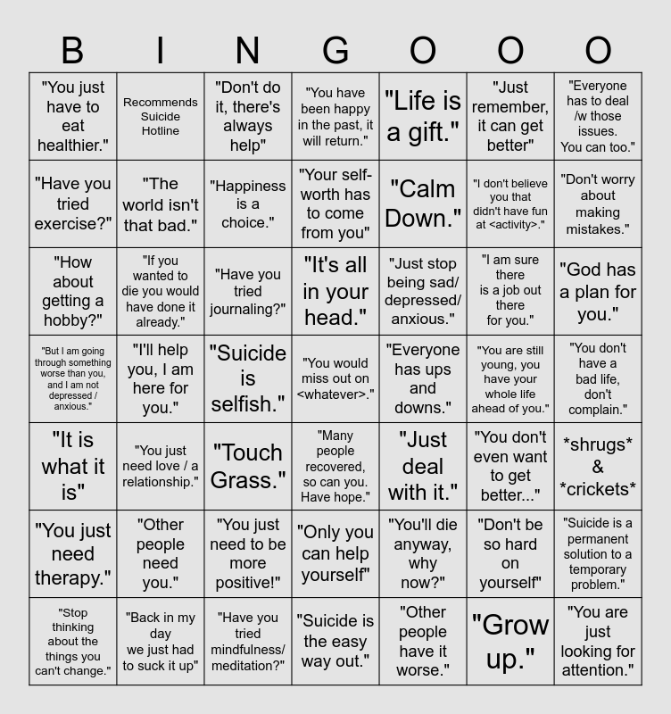 This bingo card has 49 words: "Don't be so hard on yourself", "I don't believe you that didn't have fun at <activity>.", "Other people have it worse.", "I'll help you, I am here for you.", "Have you tried journaling?", "You don't have a bad life, don't complain.", Recommends Suicide Hotline, "Have you tried mindfulness/ meditation?", "Just remember, it can get better", "Many people recovered, so can you. Have hope.", "Everyone has to deal /w those issues. You can too.", "You have been happy in the past, it will return.", "I am sure there is a job out there for you.", "Just stop being sad/ depressed/ anxious.", "Other people need you.", "You are still young, you have your whole life ahead of you.", "Have you tried exercise?", "Don't worry about making mistakes.", "Suicide is a permanent solution to a temporary problem.", "Life is a gift.", "Calm Down.", "Suicide is selfish.", "You just have to eat healthier.", "The world isn't that bad.", "Stop thinking about the things you can't change.", "Happiness is a choice.", "God has a plan for you.", "Back in my day we just had to suck it up", "It's all in your head.", "If you wanted to die you would have done it already.", "You are just looking for attention.", "Everyone has ups and downs.", "You just need therapy.", "You just need to be more positive!", "But I am going through something worse than you, and I am not depressed / anxious.", "Just deal with it.", "You don't even want to get better...", *shrugs* & *crickets*, "How about getting a hobby?", "Touch Grass.", "Only you can help yourself", "It is what it is", "You would miss out on <whatever>.", "Suicide is the easy way out.", "Your self-worth has to come from you", "Don't do it, there's always help", "You'll die anyway, why now?", "You just need love / a relationship." and "Grow up.".