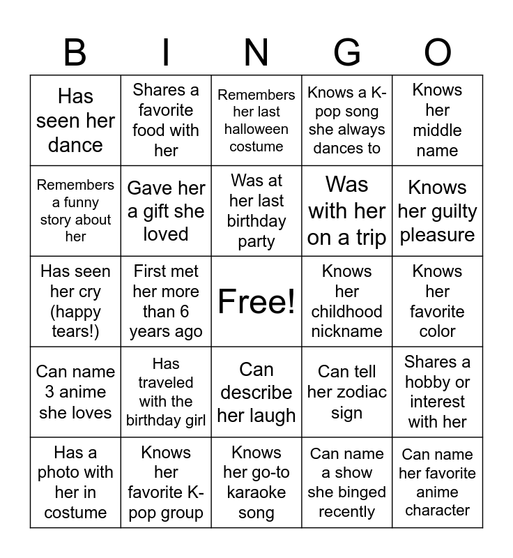 This bingo card has a free space and 25 words: Has traveled with the birthday girl, Knows her go-to karaoke song, Was at her last birthday party, Has a photo with her in costume, Knows her middle name, Has seen her dance, Remembers a funny story about her, Shares a favorite food with her, Knows her childhood nickname, Can describe her laugh, Was with her on a trip, Has seen her cry (happy tears!), Can tell her zodiac sign, Shares a hobby or interest with her, Gave her a gift she loved, Saw her embarrass herself (lovingly!), Knows her favorite color, Remembers her last halloween costume, Knows her guilty pleasure, First met her more than 6 years ago, Can name her favorite anime character, Knows her favorite K-pop group, Can name 3 anime she loves, Knows a K-pop song she always dances to and Can name a show she binged recently.