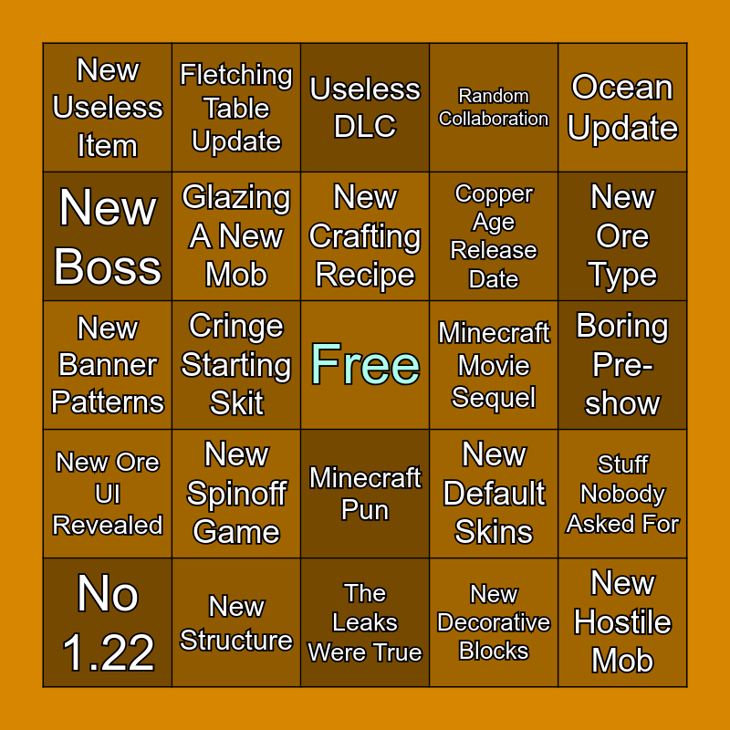 This bingo card has a free space and 44 words: New Passive Mob, New Hostile Mob, New Useless Mob, No 1.22, New Weapon, New Decorative Blocks, Useless DLC, Controllers On Java, Ocean Update, New Structure, Random Collaboration, Minecraft Movie Sequel, Minecraft Pun, New Spinoff Game, Java Vibrant Visuals, The Leaks Were True, New Armour Trims, New Banner Patterns, New Wood Type, New Ore Type, Fletching Table Update, Spear Added, New Crops Added, New Useless Item, Bedrock Glaze, Boring Pre-show, Boring After-show, Nothing Good, New Default Skins, New Ore UI Revealed, Special Guest, Stuff Nobody Asked For, Stuff Everybody Asked For, Controversial Change, Cringe Starting Skit, Mob Vote Loser Returns, New Potions, Some Sort Of Nerf, New Crafting Recipe, New Boss, Copper Age Release Date, New Game Drop, Glazing A New Mob and Villager News.
