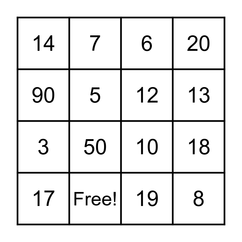 This bingo card has 28 words: 1, 2, 3, 4, 5, 6, 7, 8, Free!, 9, 10, 20, 30, 40, 50, 60, 11, 12, 13, 15, 14, 16, 17, 18, 19, 80, 90 and 0.