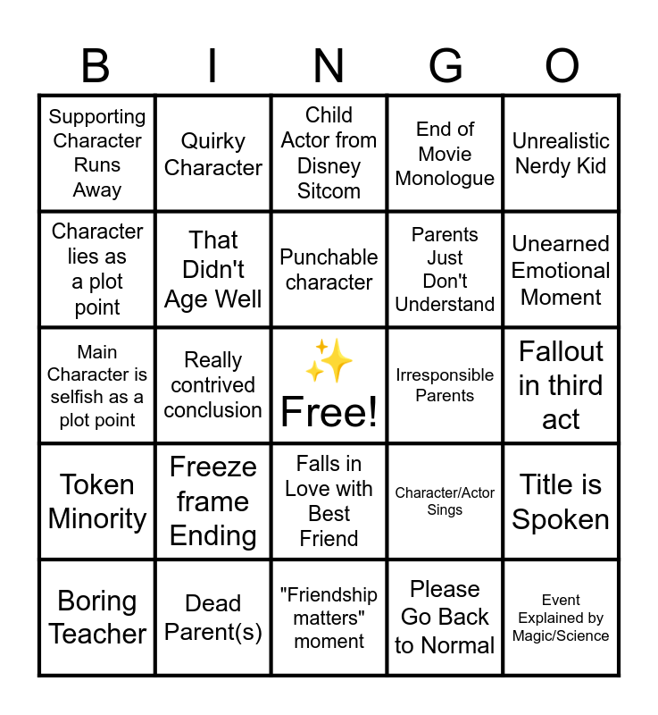 This bingo card has a free space and 24 words: Freeze frame Ending, Dead Parent(s), Punchable character, Boring Teacher, Unrealistic Nerdy Kid, Supporting Character Runs Away, Character lies as a plot point, Quirky Character, Irresponsible Parents, Falls in Love with Best Friend, Parents Just Don't Understand, Main Character is selfish as a plot point, Character/Actor Sings, Title is Spoken, That Didn't Age Well, Please Go Back to Normal, Fallout in third act, Child Actor from Disney Sitcom, Unearned Emotional Moment, Really contrived conclusion, Event Explained by Magic/Science, Token Minority, End of Movie Monologue and "Friendship matters" moment.