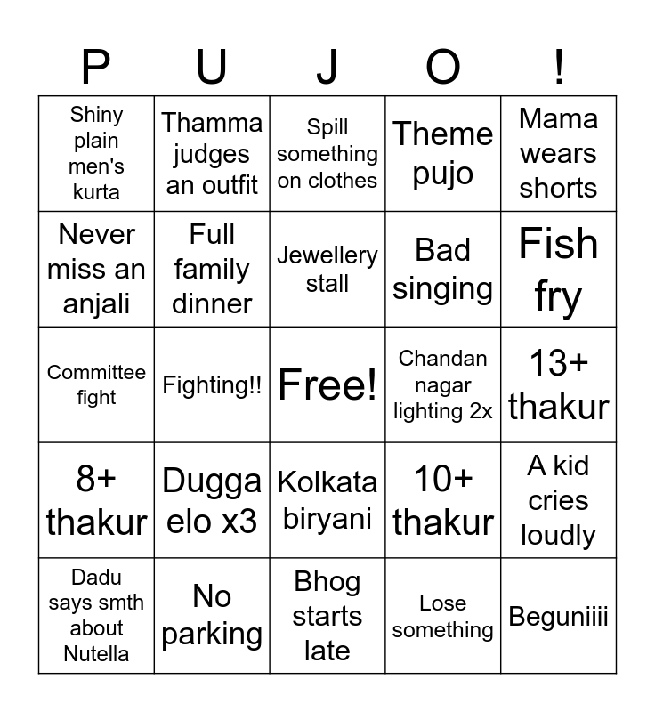 This bingo card has a free space and 34 words: 5+ thakur, Lose something, Dhaaker kaaj, Muscular mohishashur, 8+ thakur, Full family dinner, Mama wears shorts, Dadu says smth about Nutella, Thamma judges an outfit, Fight over songs in the car, Jewellery stall, Spill something on clothes, Actual pandal, Tumpa, Chandan nagar lighting 2x, Fish fry, No parking, Committee fight, Dugga elo x3, 10+ thakur, Kolkata biryani, Come home after 1, Shiny plain men's kurta, 13+ thakur, Bhog starts late, Beguniiii, Theme pujo, Gets distracted by good performance, Bad singing, Never miss an anjali, Someone cries, Fighting!!, A kid cries loudly and See committee people out of committee.