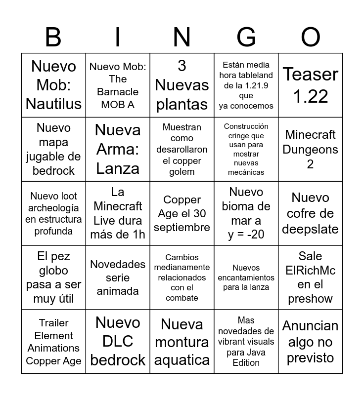 This bingo card has a free space and 24 words: Trailer Element Animations Copper Age, Novedades serie animada, Muestran como desarollaron el copper golem, Mas novedades de vibrant visuals para Java Edition, Teaser 1.22, Nuevo Mob: Nautilus, Nuevo Mob: The Barnacle MOB A, 3 Nuevas plantas, Nuevo bioma de mar a y = -20, Nuevo cofre de deepslate, Nuevo loot archeología en estructura profunda, Nueva Arma: Lanza, Nuevos encantamientos para la lanza, Sale ElRichMc en el preshow, Nuevo mapa jugable de bedrock, Nuevo DLC bedrock, Nueva montura aquatica, Están media hora tableland de la 1.21.9 que ya conocemos, Minecraft Dungeons 2, El pez globo pasa a ser muy útil, La Minecraft Live dura más de 1h, Cambios medianamente relacionados con el combate, Construcción cringe que usan para mostrar nuevas mecánicas and Anuncian algo no previsto.