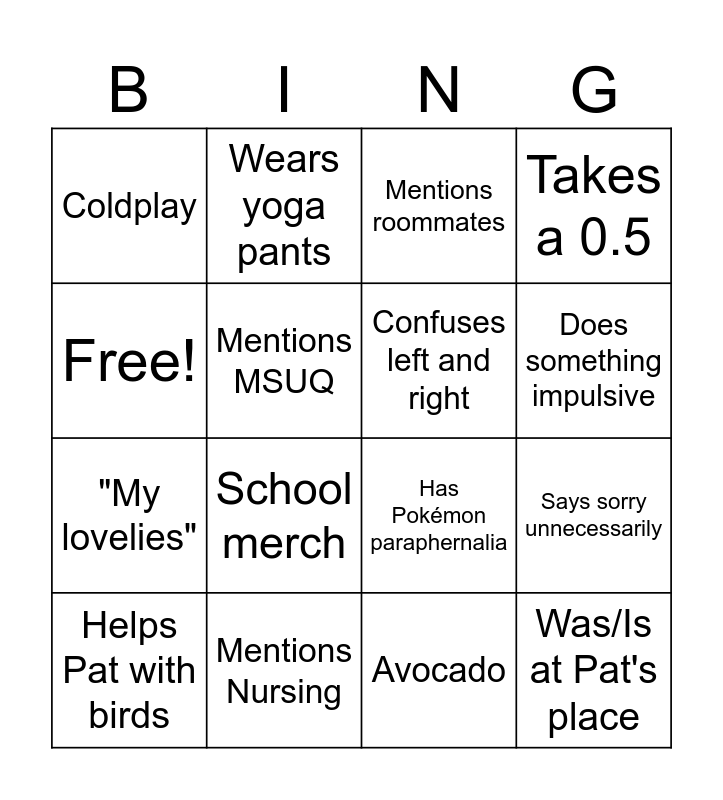 This bingo card has 16 words: Mentions Nursing, Says sorry unnecessarily, Mentions roommates, Coldplay, "My lovelies", Wears yoga pants, Has Pokémon paraphernalia, Avocado, Free!, Mentions MSUQ, Helps Pat with birds, Takes a 0.5, School merch, Does something impulsive, Confuses left and right and Was/Is at Pat's place.