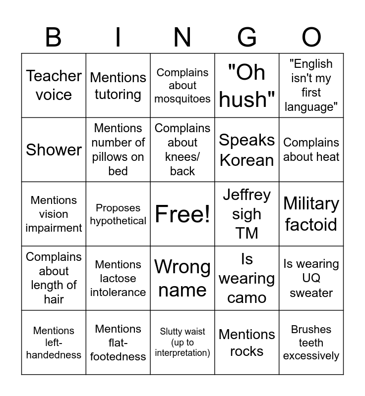 This bingo card has a free space and 24 words: Mentions lactose intolerance, Mentions flat-footedness, Complains about knees/ back, Mentions left-handedness, "English isn't my first language", Teacher voice, Shower, Mentions tutoring, Jeffrey sigh TM, Wrong name, Speaks Korean, Mentions vision impairment, Is wearing camo, Is wearing UQ sweater, Mentions number of pillows on bed, Mentions rocks, Military factoid, Complains about mosquitoes, Complains about heat, Proposes hypothetical, Brushes teeth excessively, Complains about length of hair, "Oh hush" and Slutty waist (up to interpretation).