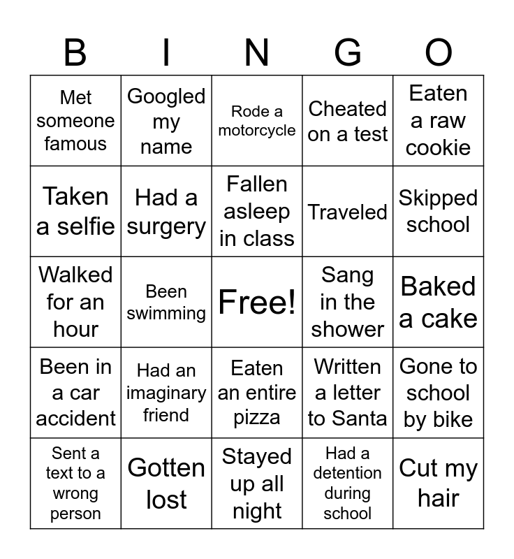 This bingo card has a free space and 24 words: Had an imaginary friend, Gotten lost, Fallen asleep in class, Sent a text to a wrong person, Eaten a raw cookie, Met someone famous, Taken a selfie, Googled my name, Sang in the shower, Eaten an entire pizza, Traveled, Walked for an hour, Written a letter to Santa, Gone to school by bike, Had a surgery, Had a detention during school, Baked a cake, Rode a motorcycle, Skipped school, Been swimming, Cut my hair, Been in a car accident, Cheated on a test and Stayed up all night.