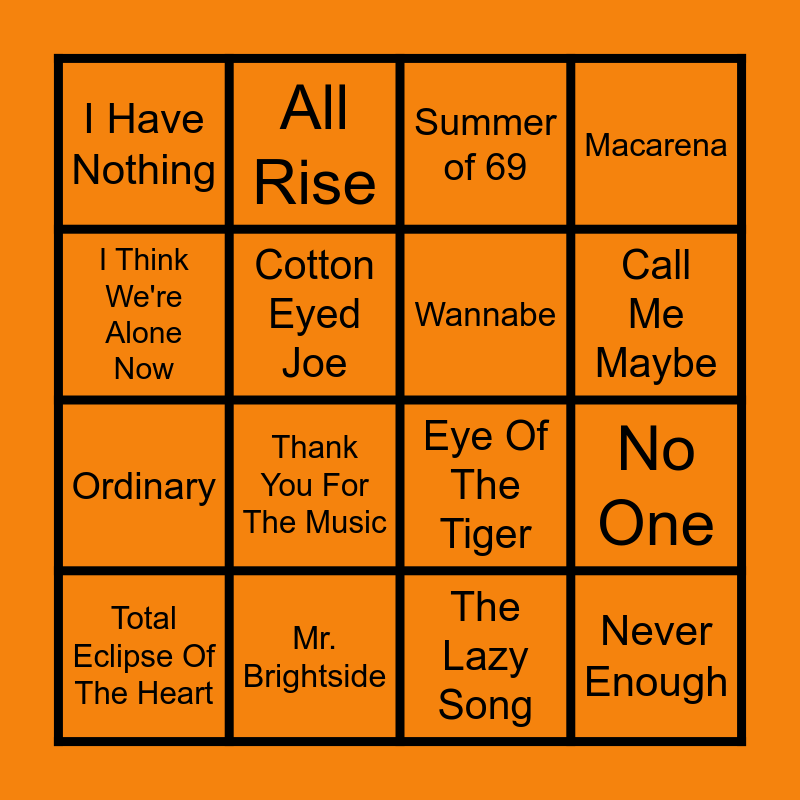 This bingo card has 60 words: September, Give It Up, Somebody To Love, Never Enough, Shallow (A Star Is Born), Waka Waka, Wannabe, Stargazing, Ordinary, Locked Out Of Heaven, Macarena, Cha Cha Slide, Cotton Eyed Joe, Hoedown Throwdown, History, I Have Nothing, Total Eclipse Of The Heart, I Think We're Alone Now, Like A Virgin, Call Me Maybe, Mr. Brightside, Summer of 69, Rockin All Over The World, Beautiful Things, Because Of You, All The Small Things, Sk8er Boi, Summer Nights, Thank You For The Music, You To Me Are Everything, HOT TO GO, Espresso, Rule The World, Mysterious Girl, All Rise, Country Roads, My Heart Will Go On, No One, Stand By Me, Eye Of The Tiger, Candy, Replay, The Lazy Song, She's So Lovely, The Way You Make Me Feel, Breakfast at Tiffanys, Don't Look Back In Anger, I Believe In A Thing Called Love, Hakuna Matata, Classic, Bad Romance, Closer, We Found Love, Sexy And I Know It, Crazy In Love, Let's Get Loud, Man Down, Gold, Misery Business and I Try.