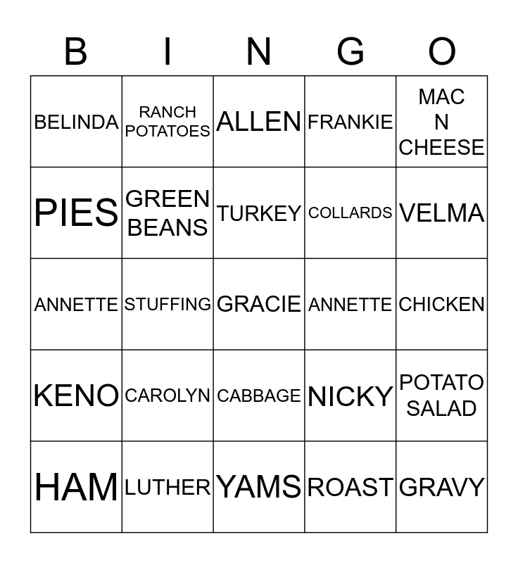 This bingo card has a free space and 24 words: CAROLYN, LUTHER, TURKEY, HAM, MAC N CHEESE, BELINDA, PIES, RANCH POTATOES, ANNETTE, CABBAGE, COLLARDS, ANNETTE, NICKY, POTATO SALAD, GREEN BEANS, ROAST, CHICKEN, ALLEN, VELMA, STUFFING, GRAVY, KENO, FRANKIE and YAMS.