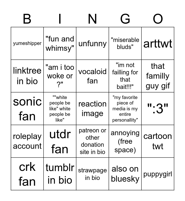 This bingo card has 25 words: utdr fan, strawpage in bio, vocaloid fan, crk fan, arttwt, yumeshipper, linktree in bio, "fun and whimsy", "my favorite piece of media is my entire personallity", patreon or other donation site in bio, "im not failling for that bait!!!", sonic fan, annoying (free space), cartoon twt, "am i too woke or ?", puppygirl, ":3", unfunny, that familly guy gif, ""white people be like" white people be like", reaction image, tumblr in bio, roleplay account, "miserable bluds" and also on bluesky.