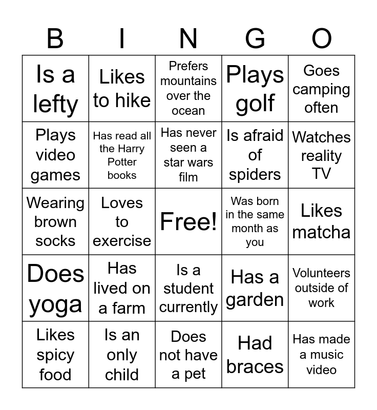 This bingo card has a free space and 95 words: Has broken their pinky toe, Has exactly 7 tattoos, Had braces, Has gone skydiving, Has traveled outside of the country, Can play an instrument, Can speak French, Is an only child, Has lived in another state, Dislikes chocolate, Has a cat, Can touch their toes, Has met a celebrity, Has never seen a star wars film, Actually flosses their teeth everyday, Is a lefty, Watches reality TV, Watches anime, Loves to sing karaoke, Hates math, Has a food allergy, Has a birthday this month, Played on a school sports team, Loves to cook, Plays golf, Plays video games, Is a vegetarian, Is afraid of spiders, Is a twin, Has 2 or more brothers, Has lived on a farm, Can do a handstand, Is not on social media, Is a night owl, Likes spicy food, Has been on TV, Does not have a pet, Wears socks to bed, Wearing brown socks, Has read more than 10 books this year, Volunteers outside of work, Loves to exercise, Is a student currently, Goes camping often, Has a garden, Was born in the same month as you, Goes to concerts regularly, Wears the same show size as you, Has used a snowmobile, Is afraid of clowns, Has been out in the ocean this summer, Can do a cartwheel, Likes to dance, Rollercoaster lover, Movie buff, Likes to draw, Likes to color, Has been on multiple cruises, Drives a motorcycle, Someone who was born in the 1980's, Has read all the Harry Potter books, Likes country music, Doesn't watch sports, Has houseplants, Knows how to surf, Has two colored eyes, Has grandchildren, Has been to six flags, Prefers mountains over the ocean, Has a snake, Goes fishing often, Favorite color is green, Has made a music video, Has the longest hair, Loves the beach, Took a vacation out of state this summer, Likes to do yard work, Likes to clean, Is a morning person, Likes to hike, Only has sisters, Only has brothers, Afraid of heights, Has been with ESS more than 10 years, Likes matcha, Does yoga, Likes to journal, Is double jointed, Oldest of siblings, Youngest of siblings, Only likes spring water, Has been married for more than 10 years, Over six feet tall, Favorite holiday is Christmas and Had colorful hair before.