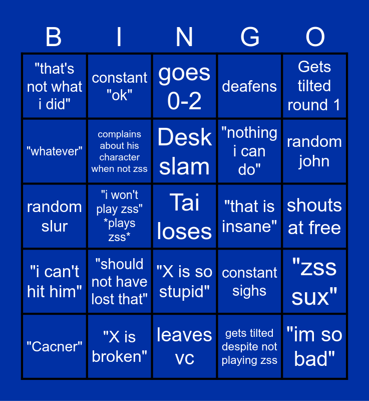 This bingo card has a free space and 24 words: "should not have lost that", "X is broken", Desk slam, "Cacner", Gets tilted round 1, "that's not what i did", "whatever", constant "ok", "that is insane", "X is so stupid", "nothing i can do", random slur, constant sighs, "zss sux", complains about his character when not zss, gets tilted despite not playing zss, shouts at free, goes 0-2, random john, "i won't play zss" *plays zss*, "im so bad", "i can't hit him", deafens and leaves vc.
