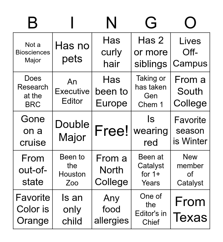 This bingo card has a free space and 24 words: Been to the Houston Zoo, Is an only child, Has been to Europe, Favorite Color is Orange, Lives Off-Campus, Not a Biosciences Major, Does Research at the BRC, Has no pets, Is wearing red, From a North College, Taking or has taken Gen Chem 1, Gone on a cruise, Been at Catalyst for 1+ Years, New member of Catalyst, An Executive Editor, One of the Editor's in Chief, Favorite season is Winter, Has curly hair, From a South College, Double Major, From Texas, From out-of-state, Has 2 or more siblings and Any food allergies.