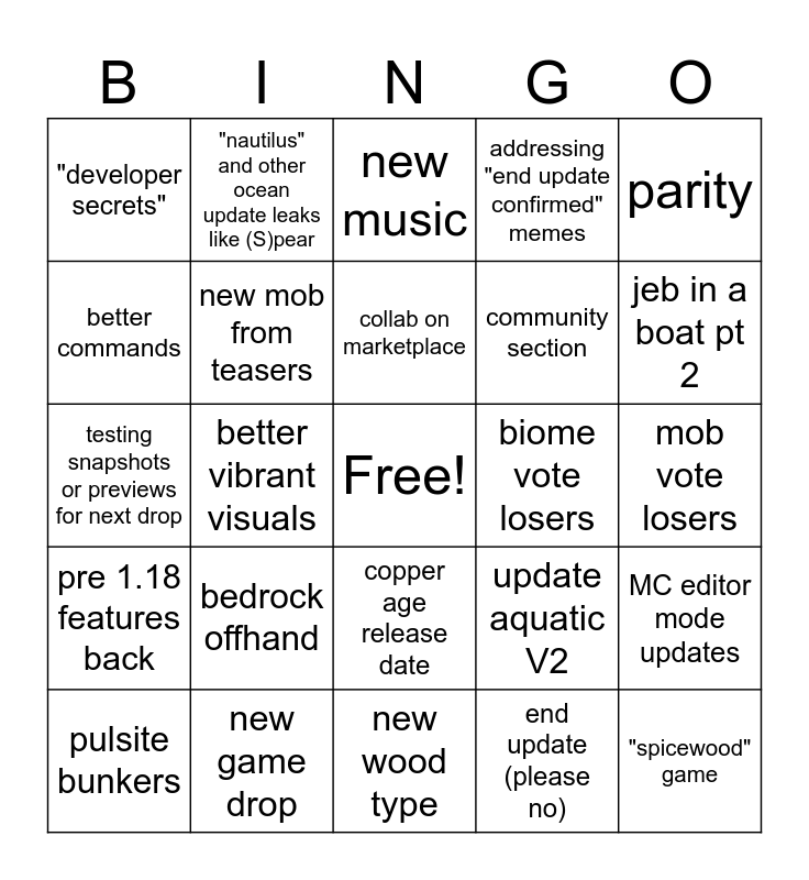 This bingo card has a free space and 24 words: bedrock offhand, new game drop, collab on marketplace, pulsite bunkers, parity, "developer secrets", better commands, "nautilus" and other ocean update leaks like (S)pear, biome vote losers, copper age release date, community section, testing snapshots or previews for next drop, update aquatic V2, MC editor mode updates, new mob from teasers, end update (please no), mob vote losers, new music, jeb in a boat pt 2, better vibrant visuals, "spicewood" game, pre 1.18 features back, addressing "end update confirmed" memes and new wood type.