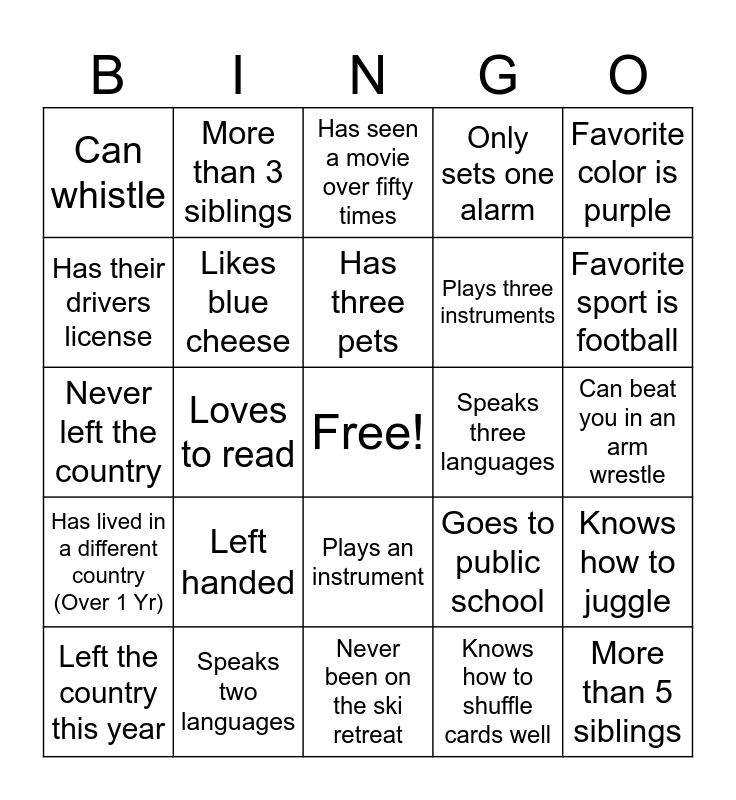 This bingo card has a free space and 24 words: Left handed, Speaks two languages, Has three pets, Left the country this year, Favorite color is purple, Can whistle, Has their drivers license, More than 3 siblings, Speaks three languages, Plays an instrument, Plays three instruments, Never left the country, Goes to public school, Knows how to juggle, Likes blue cheese, Knows how to shuffle cards well, Can beat you in an arm wrestle, Has seen a movie over fifty times, Favorite sport is football, Loves to read, More than 5 siblings, Has lived in a different country (Over 1 Yr), Only sets one alarm and Never been on the ski retreat.
